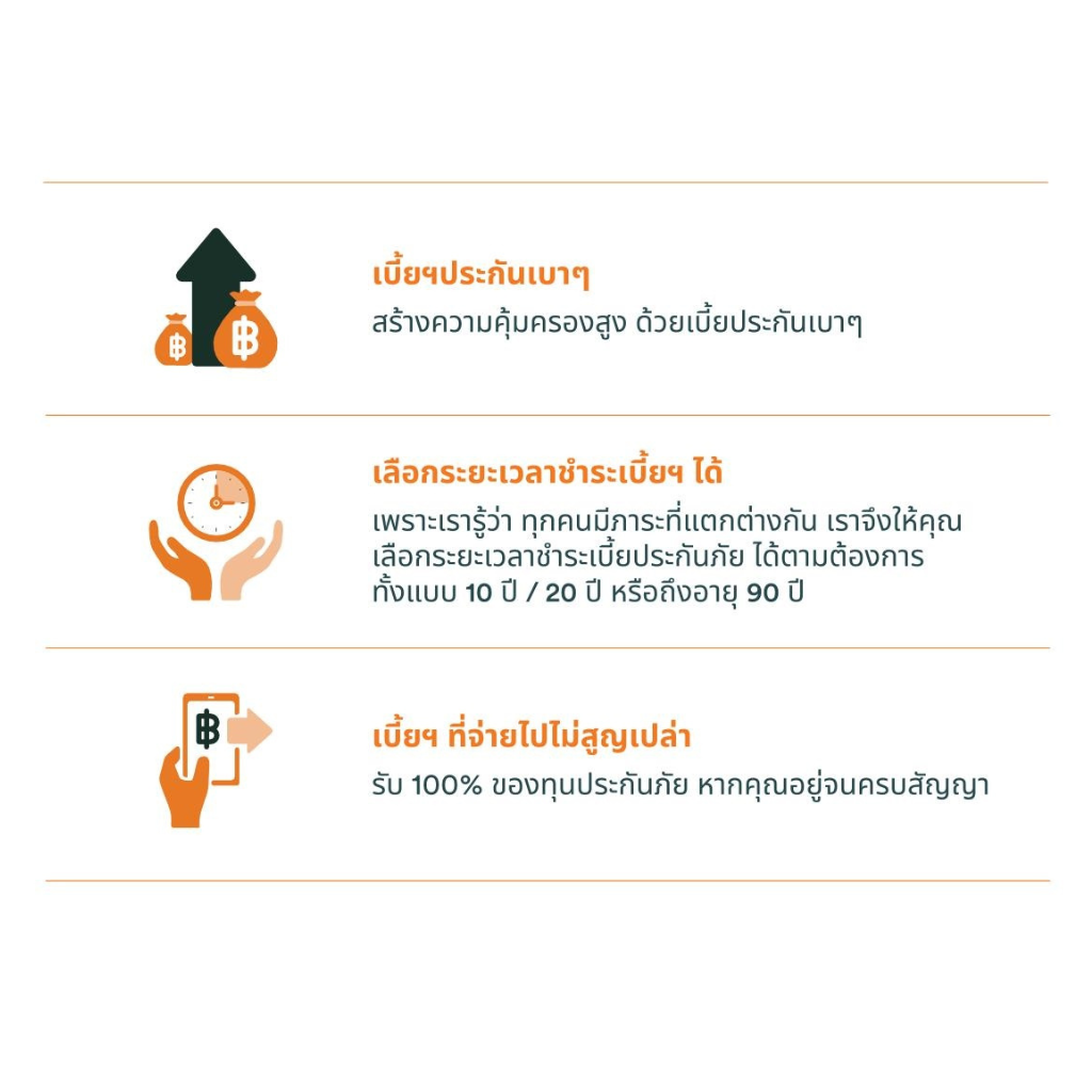 เราให้คุณได้สร้างหลักประกันความมั่นคงเพื่อครอบครัวอย่างอุ่นใจ คุ้มค่าด้วยการจ่ายเบี้ยประกันภัยเบาๆ ตามแผนที่เราแนะนำ มั่นใจได้ว่าอนาคตของคนที่คุณรักจะสามารถก้าวต่อไปได้อย่างมั่นคงไม่มีสะดุด